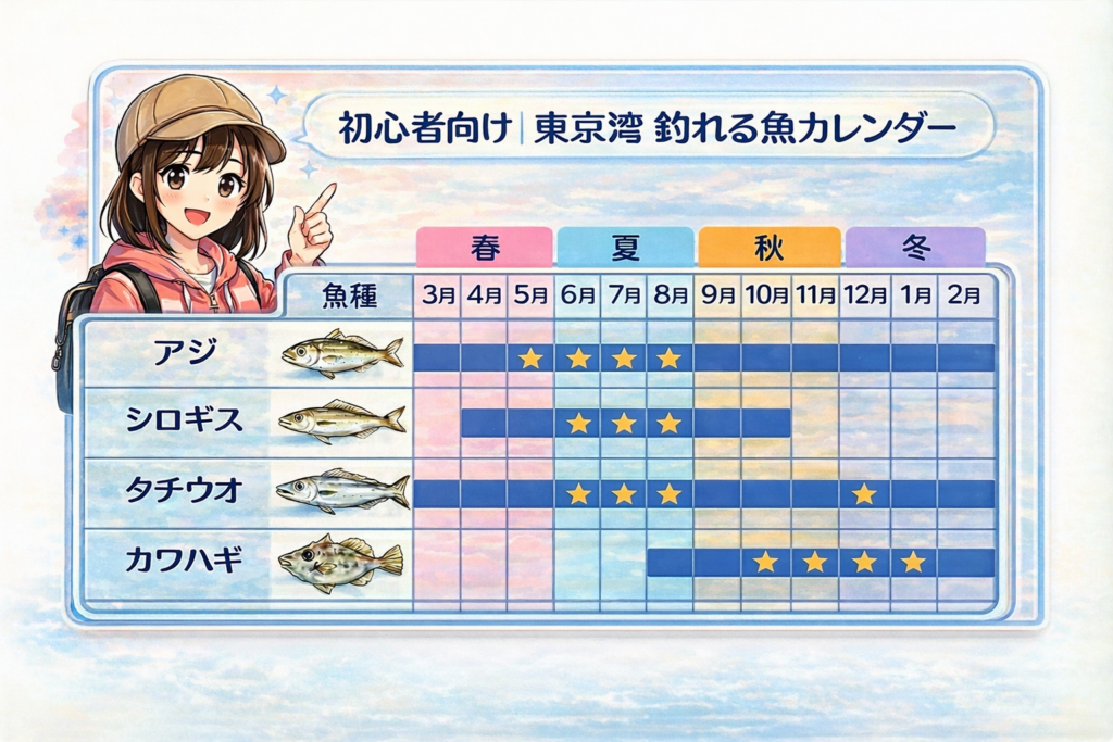 迷ったときは、アジ・シロギス・イサキ・タチウオのように、比較的アタリが出やすい魚を選ぶと安心です(釣り物は季節や船宿によって変わります)。