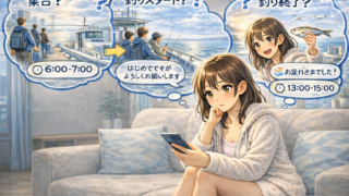 釣り未経験・初心者向けに、釣船の1日の流れを集合から解散まで分かりやすく解説。東京湾のアジ釣りを想定し、集合時間、座席、持ち物、船酔い対策まで紹介します。